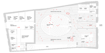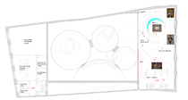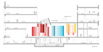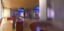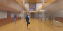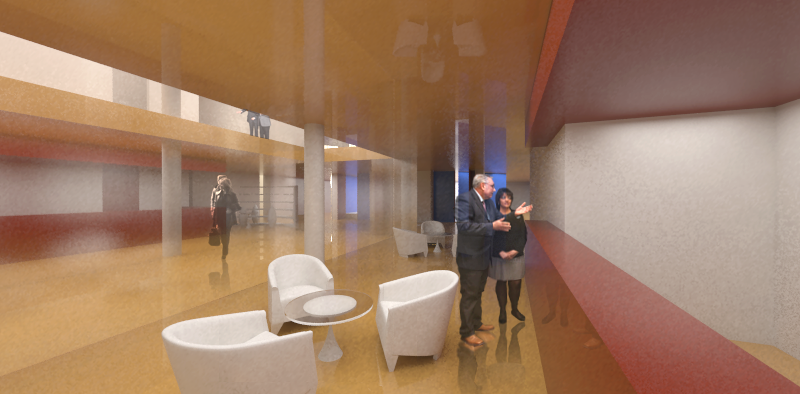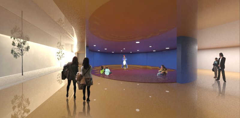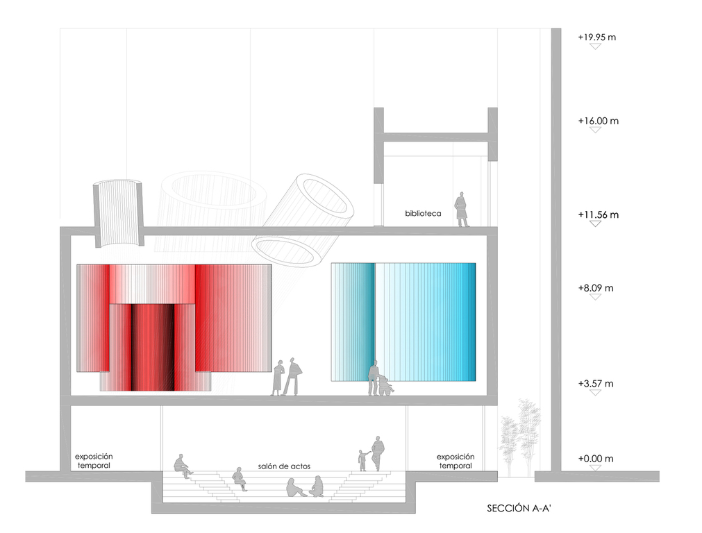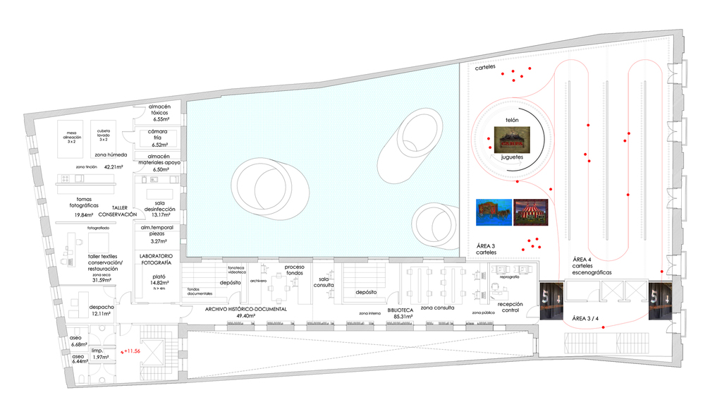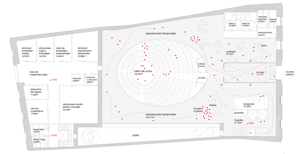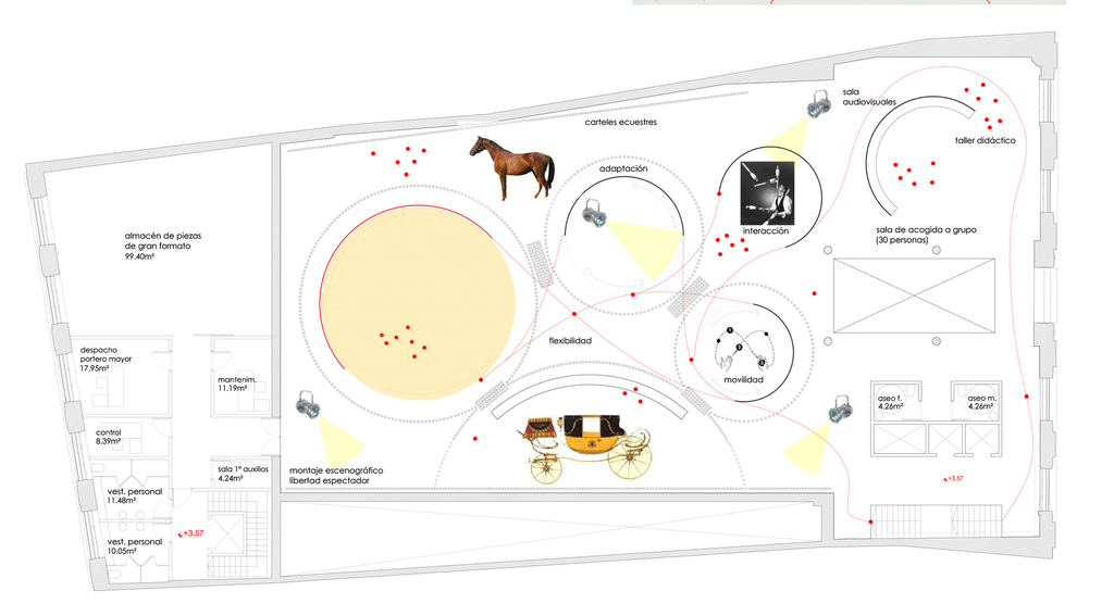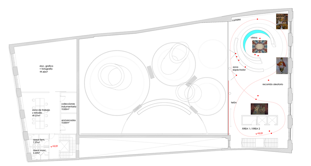 Una luz de color, cambiante, y focalizada emulará los antiguos focos dirigidos al artista, creando destacadas sombras y contrastes. El visitante encuentra tras el obligado cortavientos, un espacio flexible, diáfano, que comunica visualmente todos los servicios que se ofrecen.