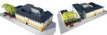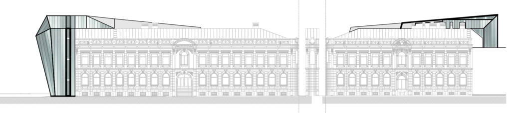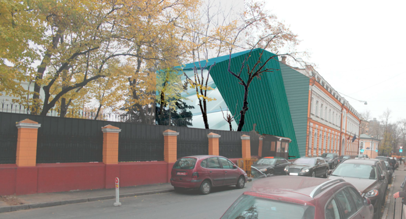 La imagen final de la propuesta es uno de los argumentos fuertes de nuestro planteamiento. Por su ubicación, la embajada ocupa una de las zonas más representativas de Moscú, donde edificios palaciegos que albergan embajadas se combinan con otros más contemporáneos propios de la época soviética, e incluso más recientes. En este contexto, la propuesta toma la silueta de cubiertas de cobre con paños inclinados como elemento de integración principal, generando una silueta plegada que acompaña al resto de volúmenes.