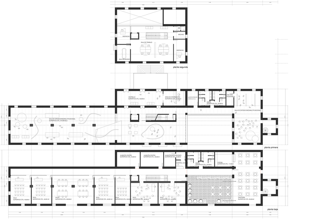La posición del edificio en la parcela y sus cotas de acceso, sugieren la diferenciación de los usos por plantas, tal y como fue concebido. Consta por tanto de una planta “noble”, en el acceso principal al norte, una planta de servicios al sur, y una segunda planta que gravita en el centro de la pieza destacando la categoría del conjunto.