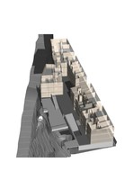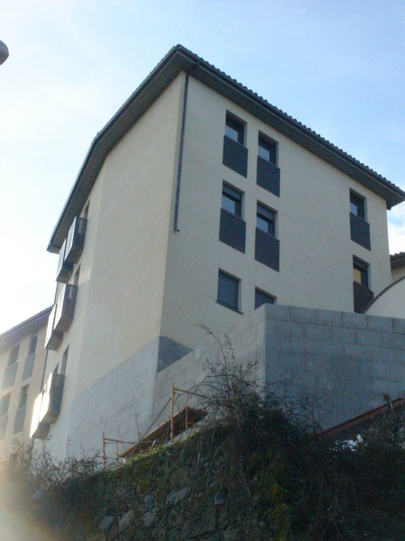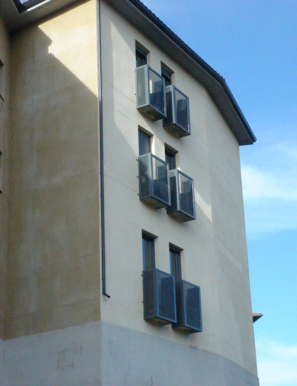 El proyecto opta por fragmentarse para realizar un volumen en contacto y remate de los edificios de vivienda protegida que se sitúan al Oeste, y realizar un volumen exento rematando el encuentro de las calles. De esta forma se consigue una fragmentación que integra la propuesta en el entorno. Además se libera espacio para la realización de un “balcón” en la parte norte del conjunto, zona que será ocupada por las zonas de juego y estancia al aire libre.