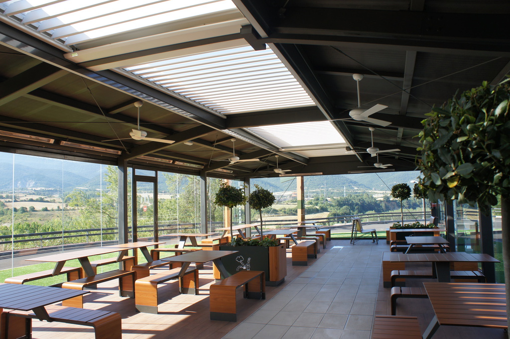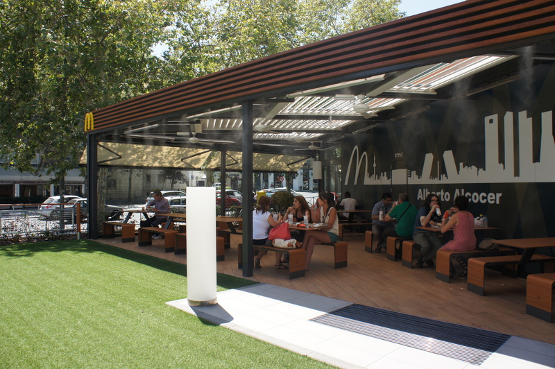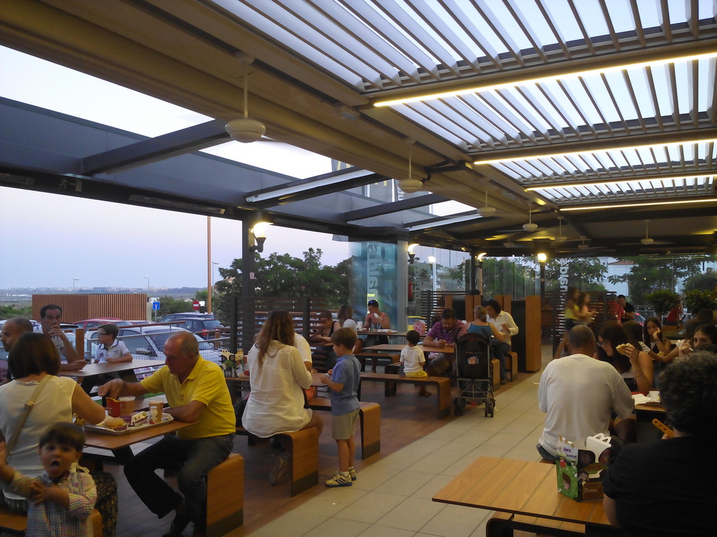 Terraza de 70 m2 en Madrid construida llave en mano junto a Mejor Afuera para Restaurantes Mc Donalds. Con estructura metálica, cubierta mixta de policarbonato de alta protección solar y de lamas orientables motorizadas y fachada combinando vidrio fijo y cortina de cristal. Incorpora elementos de acondicionamiento térmico tanto para invierno como para verano, permitiendo su uso todos los días del año. La automatización de los elementos constitutivos de la terraza optimiza los costes de operación del establecimiento. Su diseño la convierte en terraza de referencia en la ciudad.